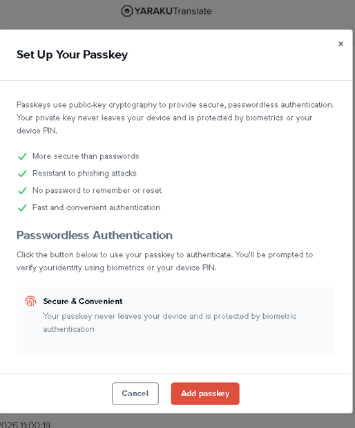 You can set up a Passkey for your Yaraku Translate account by going to the Settings page and clicking on the red “Set up a passkey” button*.